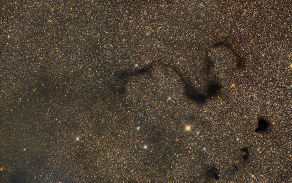 前々回のコウモリに引き続いて動物シリーズ。スネーク星雲(Snake Nebula)です。正式にはBarnard 72といい、へびつかい座に鎮座しています。へびは神の使い。黄金色の天の川を背景に、とっても神々しい姿をしています。へびは脱皮を繰り返すので「破壊と再生」のシンボルでもあるそうです。