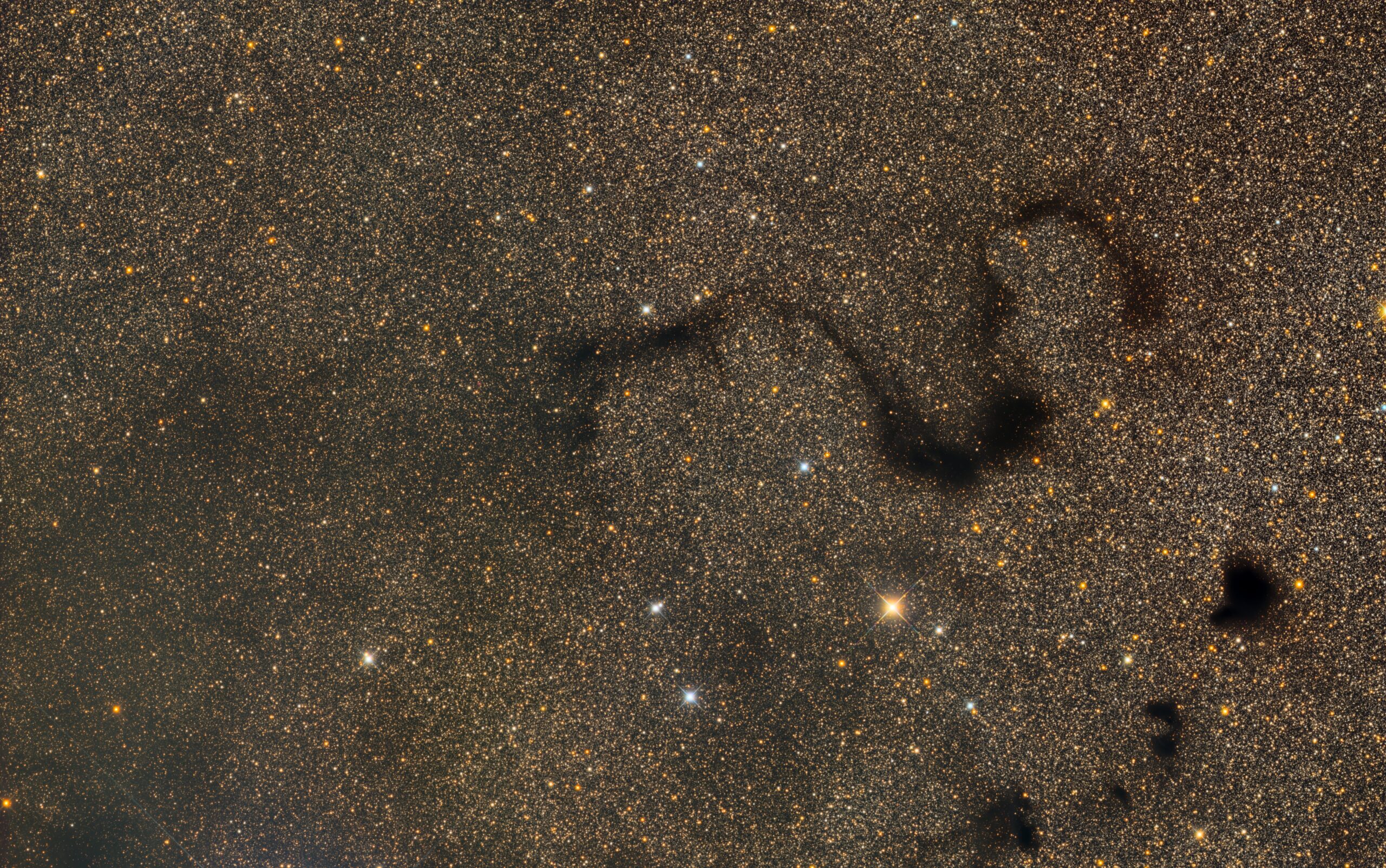 私は背景色をニュートラル化(グレーにすること)処理をして、灰色にしちゃっていたのです。我らが天の川は黄金色! 処理をしなおして冒頭の神々しい蛇になりました。こんなところにM&Mさんと私の、天文キャリアや経験の差が如実に出た感じです。