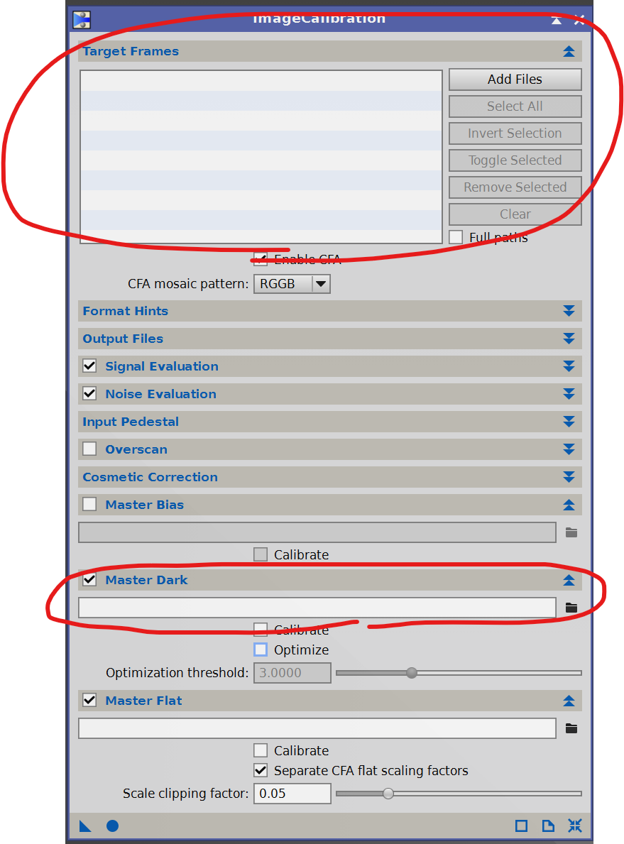 まず、WBPPから離れてImageCalibrationプロセスでキャリブレーションをしてみるとどうでしょうか?ひとまずフラット補正を無視することにして、添付の設定で、ライトフレームと、ダークフレームを指定します。その際