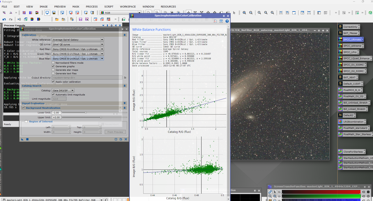 Optolong L-UltimateはOIIIとHaを選択的に透過するデュアルバンドフィルターですが、アンドロメダをはじめとする銀河は連続光なんです。星雲の場合はOIIIとHaの光が強いので、その光を選択的に取得することで、ナローバンドでもブロードバンドに近い画像処理が可能です。