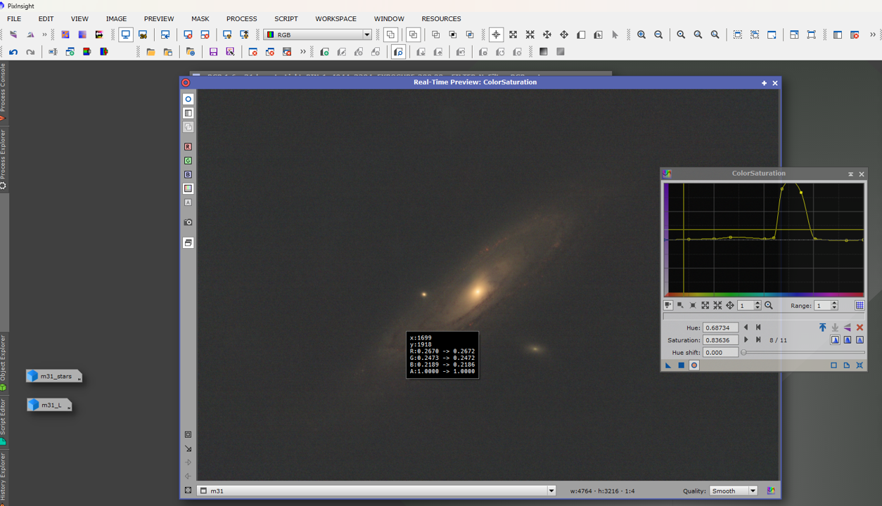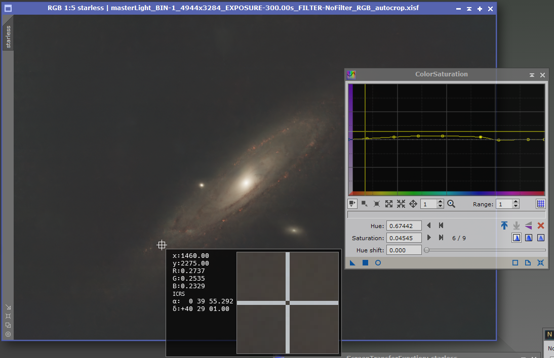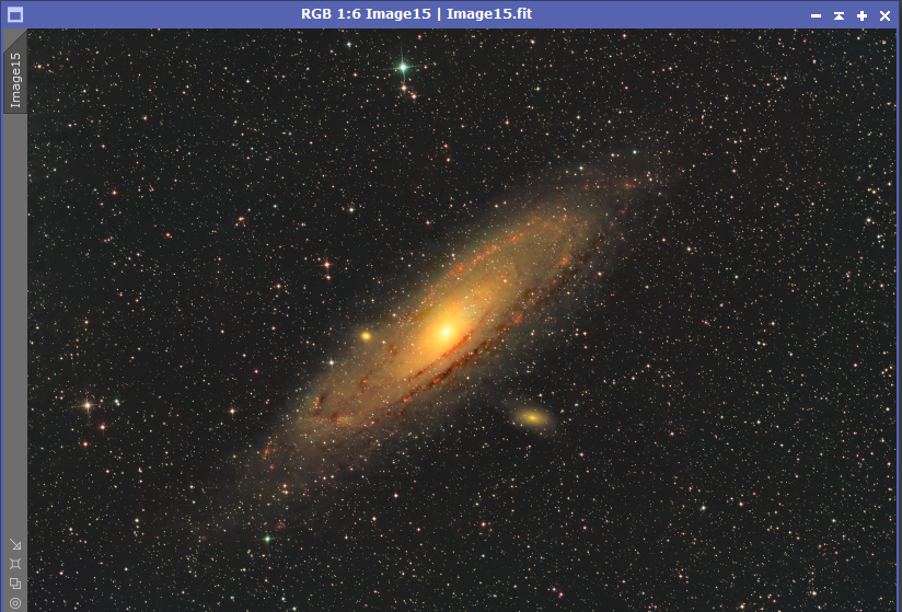 です。こうすると、現在黄色っぽくなっている銀河の中心を白くする処理が行われるので、相対的に銀河の腕が青くなるかもしれません。