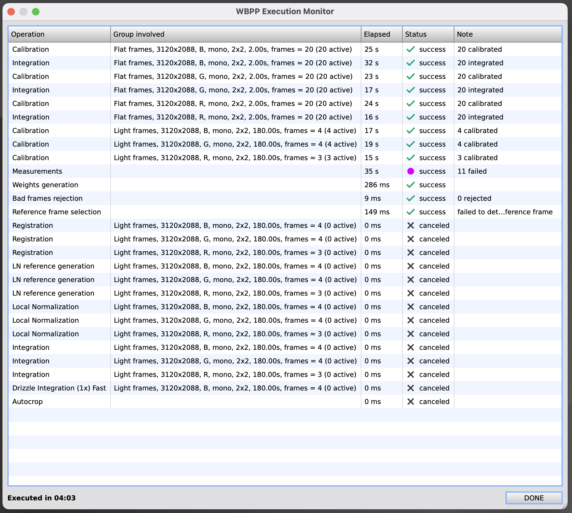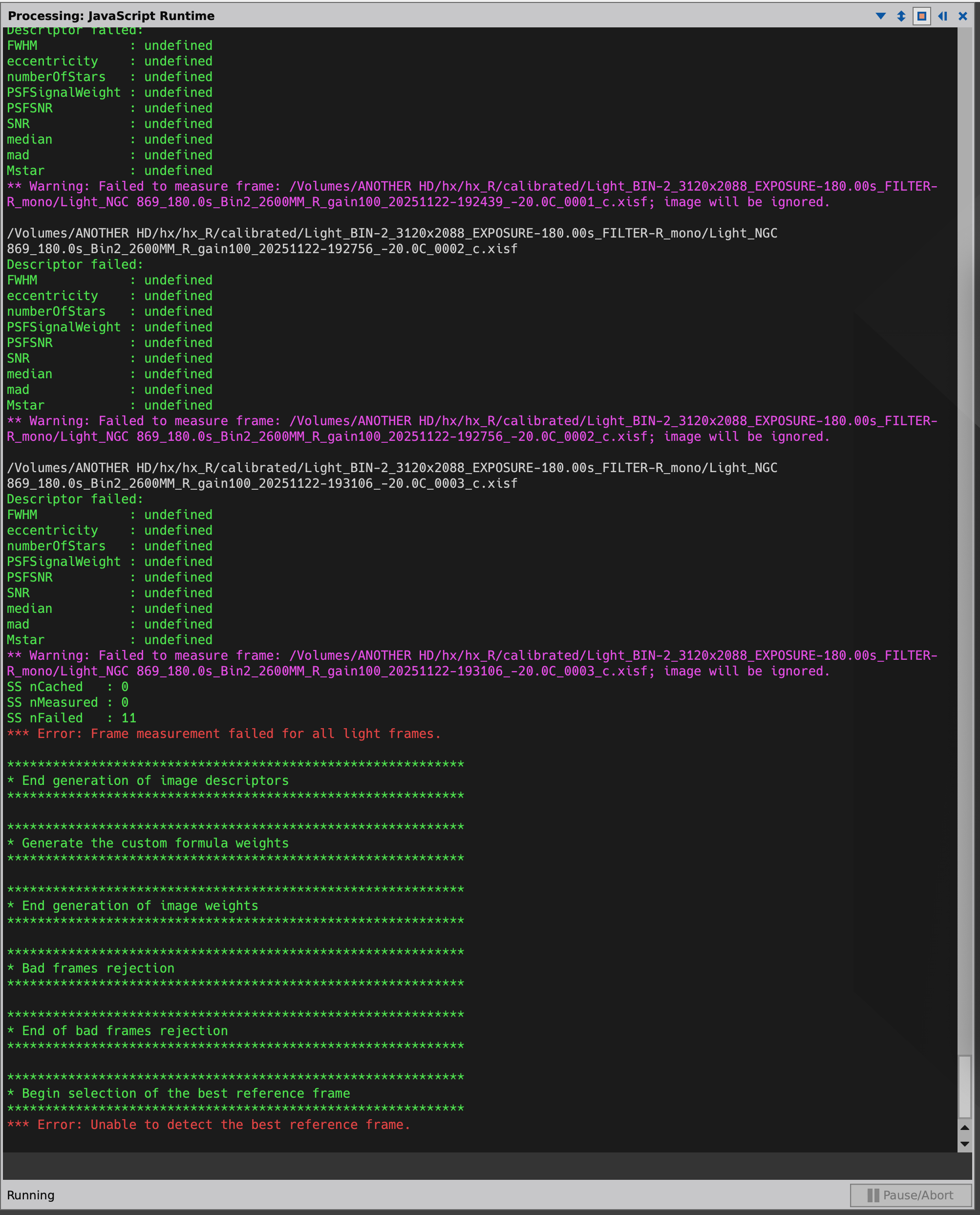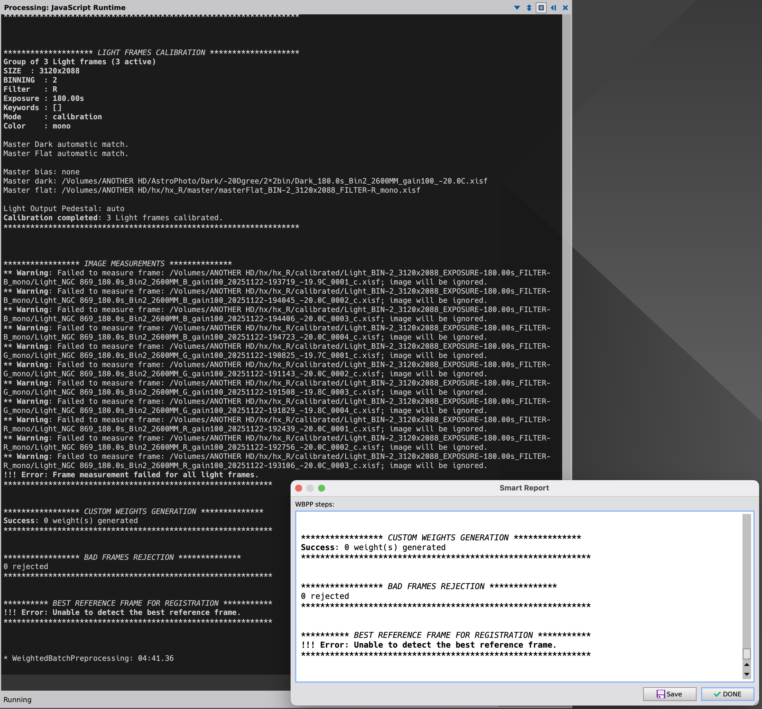 <p style=”text-align: left;”>ちなみにFBPPでやってみるとまったく問題なく処理が完了しました。FBPPでも良いのでしょうが、複数日にまたがる撮影や鏡筒反転した場合を考えると、おそらくRegistrationが強力なWBPPでないと良くないのではないかと思われます。なんとかWBPPで処理できないかと思案しています。</p>Measurementの結果は重みづけでも使われるので、先の私の提案はあまり意味がありませんでした。失礼しました。
