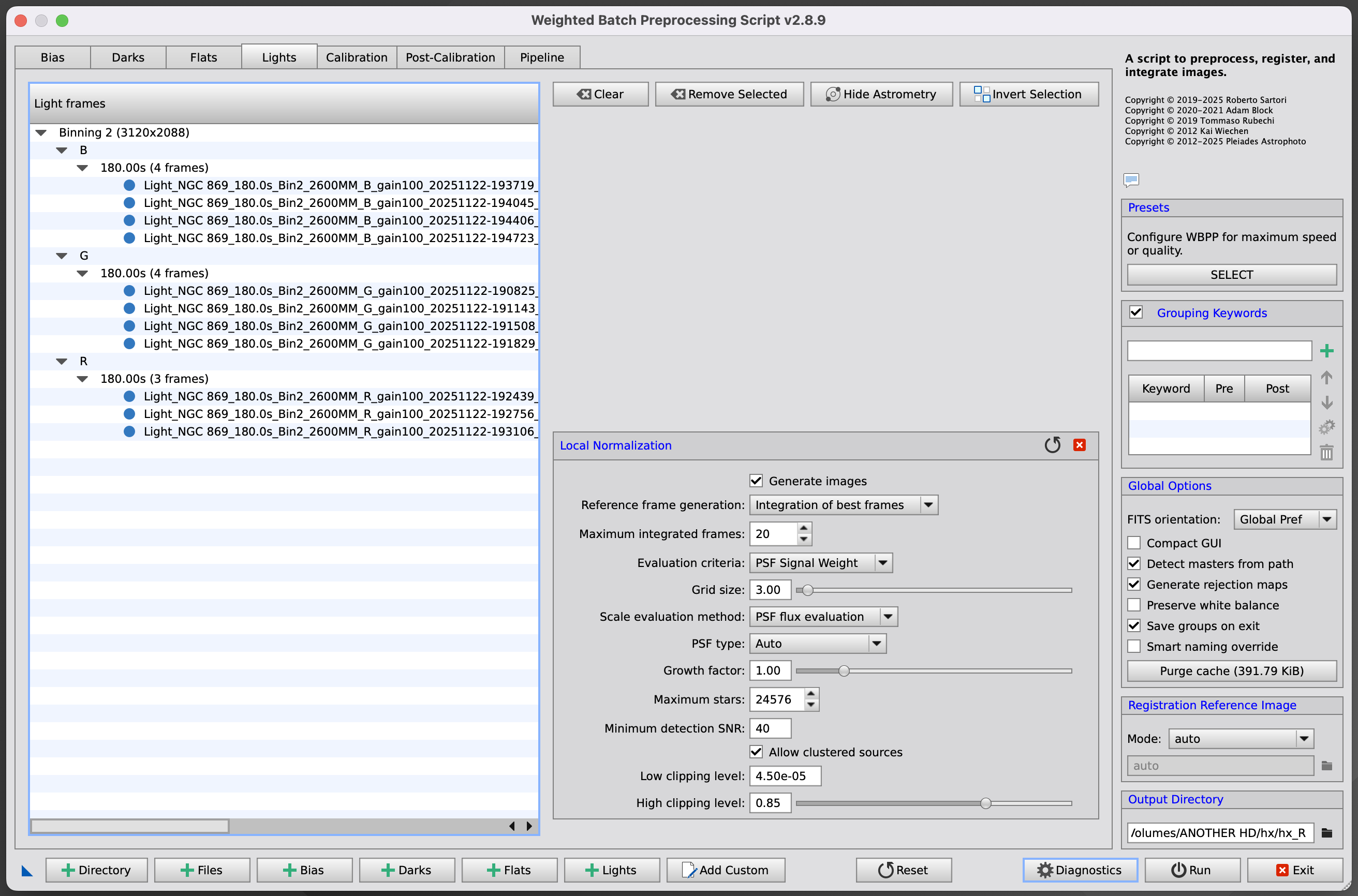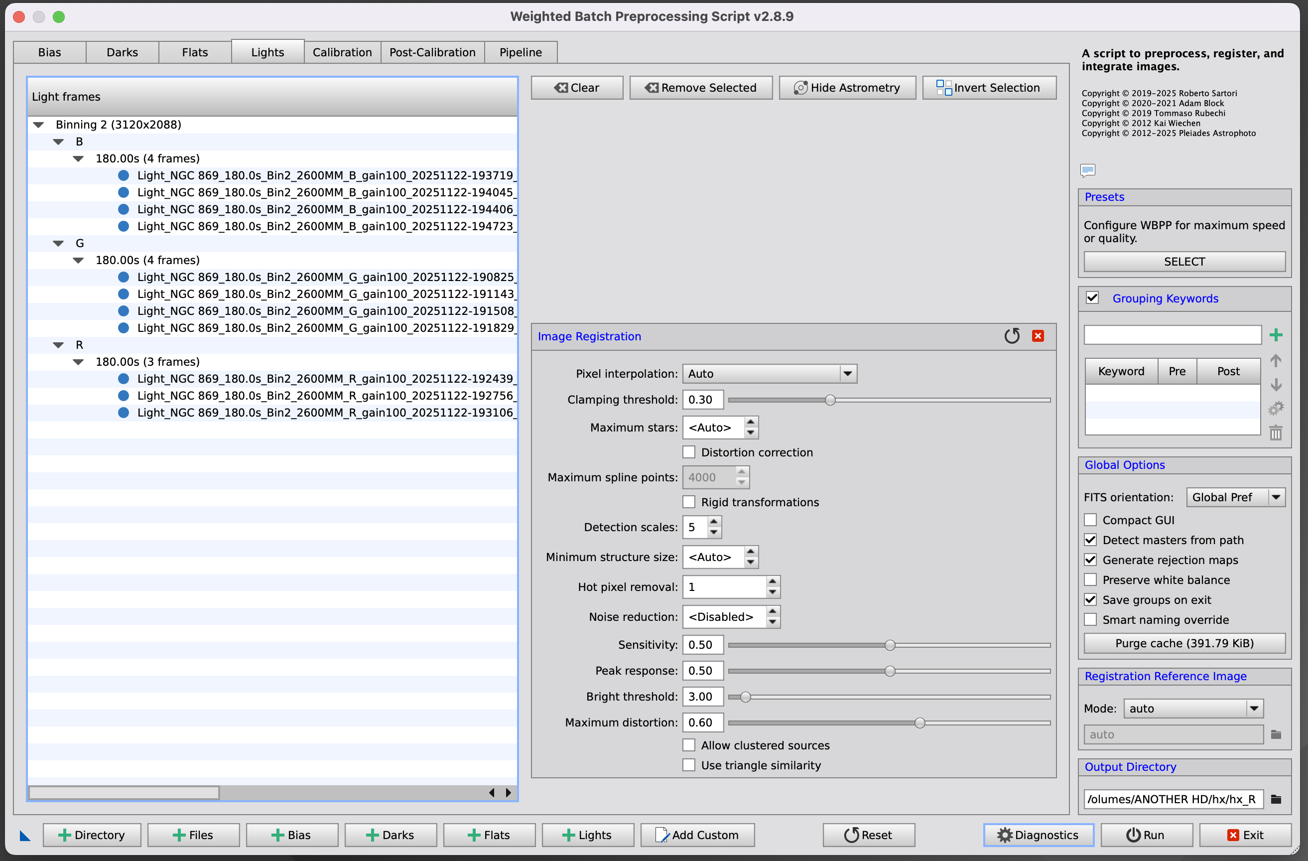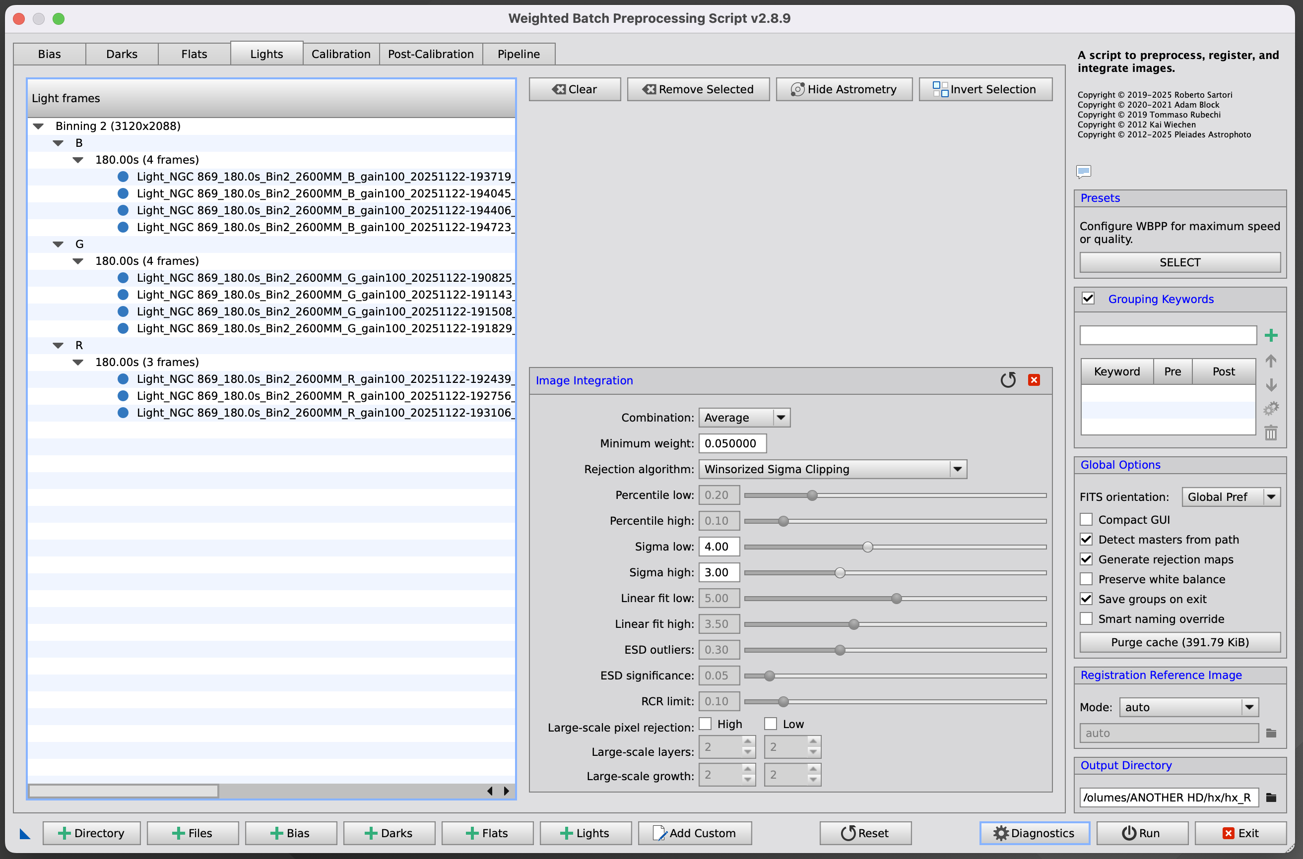 <p style=”text-align: left;”>ちなみにFBPPでやってみるとまったく問題なく処理が完了しました。FBPPでも良いのでしょうが、複数日にまたがる撮影や鏡筒反転した場合を考えると、おそらくRegistrationが強力なWBPPでないと良くないのではないかと思われます。なんとかWBPPで処理できないかと思案しています。</p>Measurementの結果は重みづけでも使われるので、先の私の提案はあまり意味がありませんでした。失礼しました。