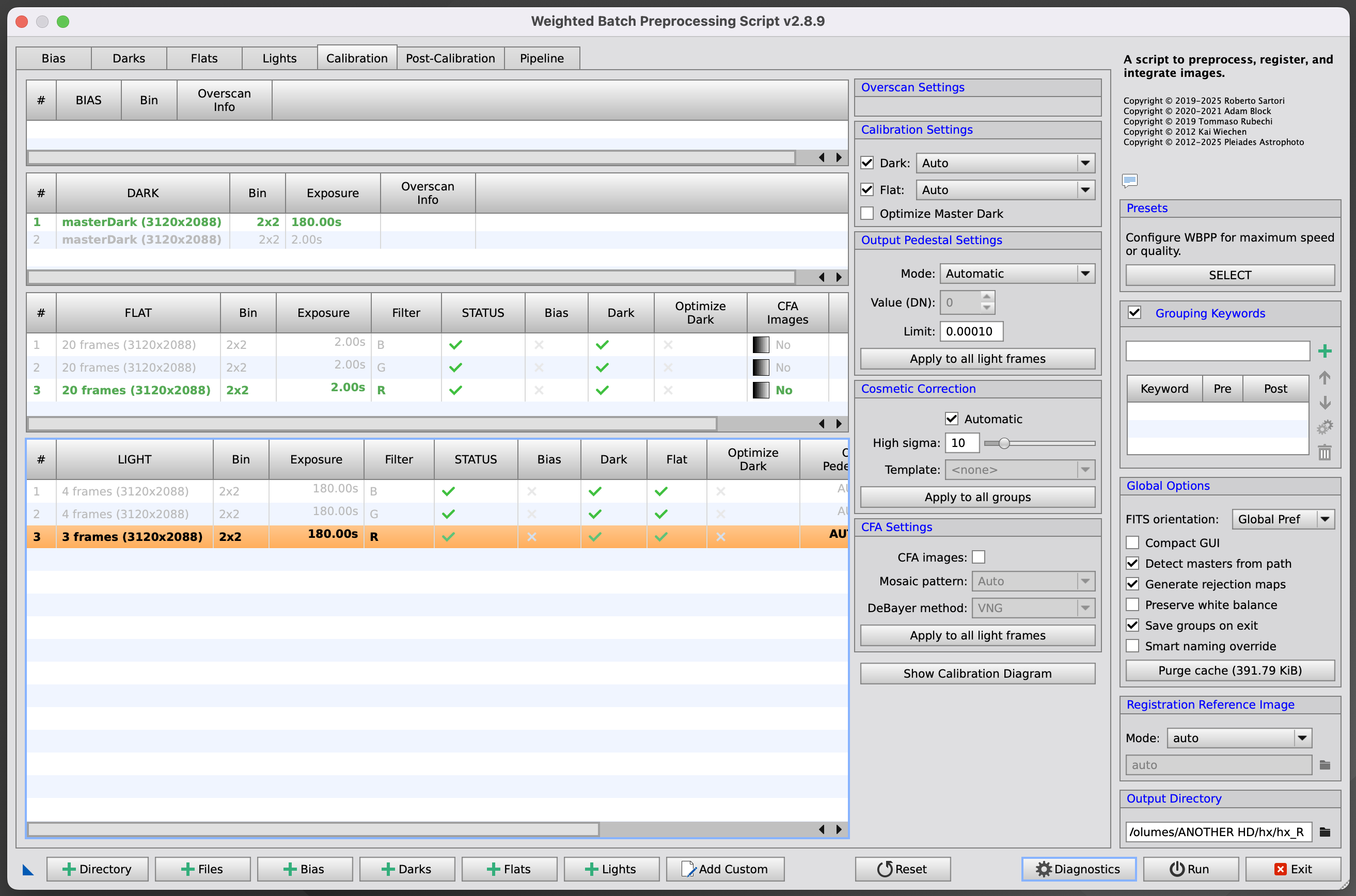(1)WBPPのCalibration画面です。R、G、BそれぞれのLight、Dark、Flatを入れています。