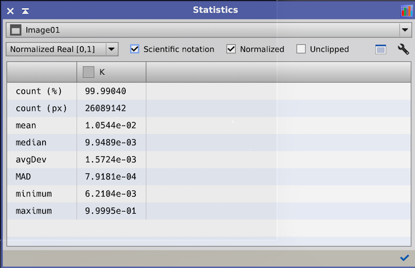 Calibratedフォルダの下のLとRGBの画像データをいくつか開いて、ProecesメニューのAll Processesの下にあるStatisticsを実行してみてくださいませんか。