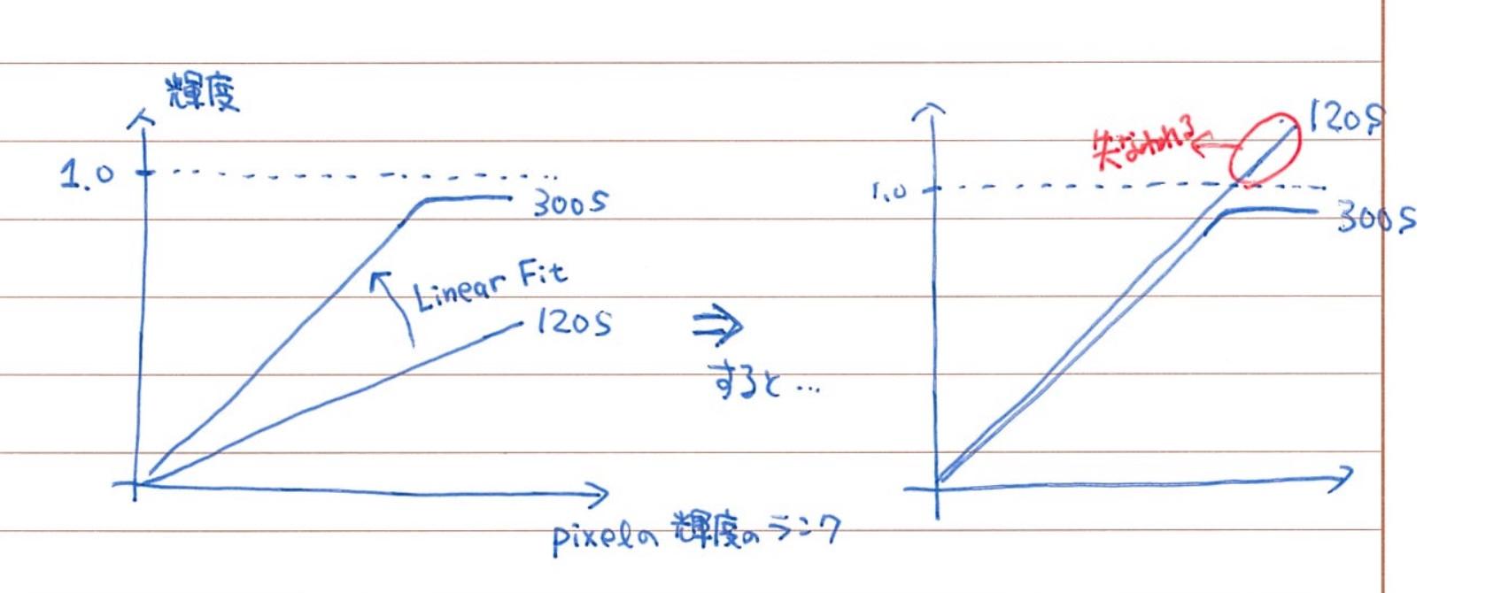 - 例えば300秒露光の画像をreferenceにして短秒の画像をLinearFitしてしまうと、短秒露光のもともと飽和していなかったピクセルが飽和するか飽和に近い状態になってしまい、損をしないか