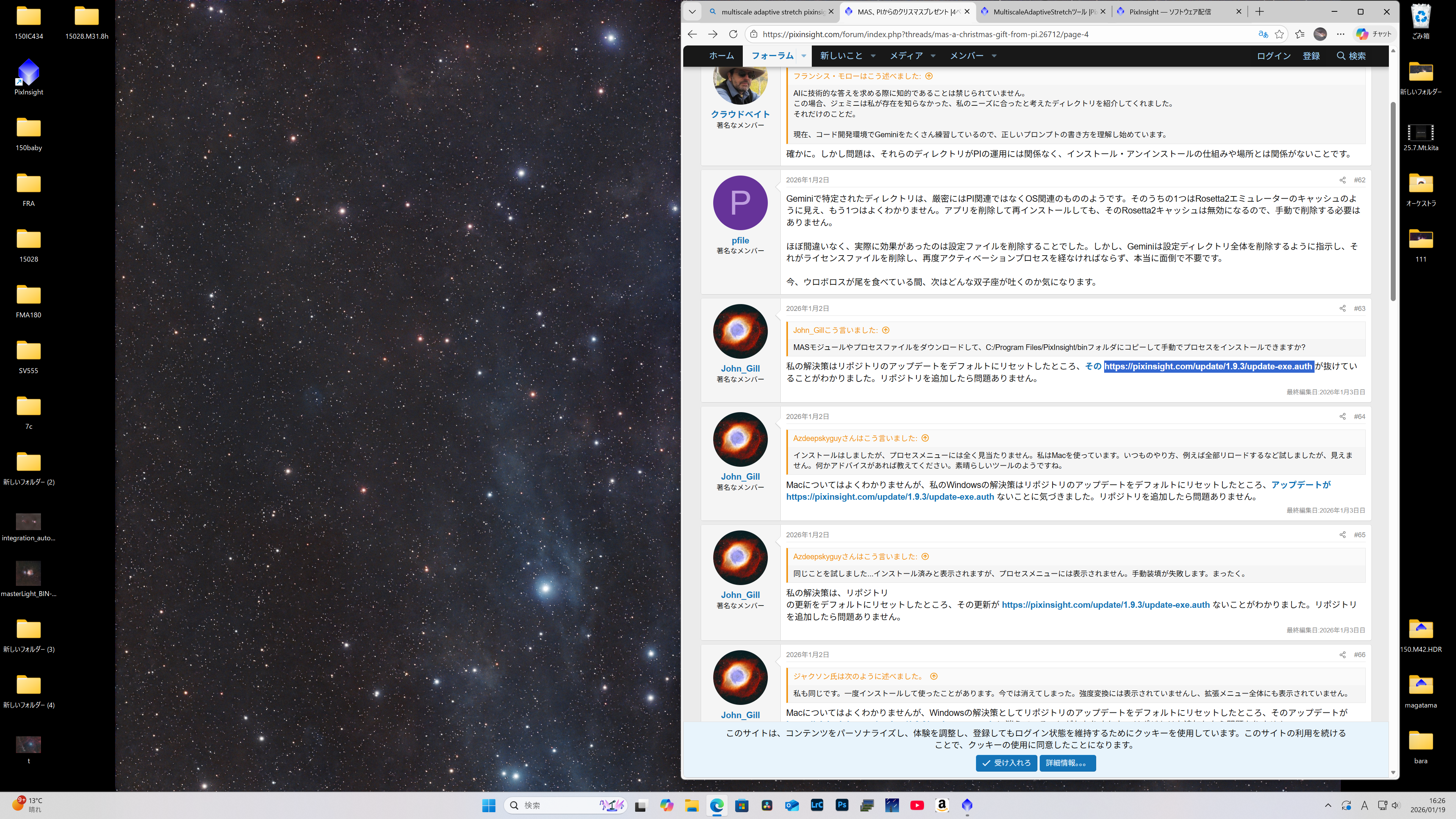 MASが消える 2026.01.31 検索: このトピックには4件の返信、2人の参加者があり、最後にMasahiko Niwa/丹羽雅彦により3週、 1日前に更新されました。 5件の投稿を表示中 - 1 - 5件目 (全5件中) 投稿者 投稿 2026年1月15日 10:23 #27155 まさおゲスト 突然PIがダウンして、立ち上げたらMuttiscal Adaptivestrechが消えていました。いろいろ探して、process>Modules>Install Modules>searchでC:/Program……..MASpxm.dllがでてきてinstallすると無事proseccの中に復活して使えるようになるのですが、その状態でWPPSを実行するとPIがダウンしてしまい、再起動するとMASが消えている。という状態です。なんどやっても同じ結果です。どうすればよいでしょうか?また、MASが消えた時に探している経過でResouces>update>Manage Repositoriesもなかの上3つ(2025・12におそらくアップデートされたもの)を消してしまいました。これを再度入れる方法を教えてください。よろしくお願いします。 2026年1月15日 11:40 #27157 Masahiko Niwa/丹羽雅彦キーマスター まさおさん こういう状況になった場合は、一度PixInsight をアンインストールして、もう一度インストールし直すのが一番良いと思います。 どこかの情報が不正になっていたり、モジュールが壊れたりしている可能性があります。 お試しください。まだ不具合が起きていそうでしたら、お教えください。 2026年1月15日 12:32 #27158 だいこもん (たの天アンバサダー)参加者 私も、PixInsightがダウンした後いくつかのスクリプトが消える症状を経験したことがあります。その時も再インストールしました。 2026年1月20日 10:39 #27177 まさおゲスト 何回も再インストールしてもダメだったので、PIのサイトで見つけた上記のレポジトリーをいれたら治りました。MASも復活してWBppも新しいバージョンになりました。ありがとうございました。 2026年1月23日 21:04 #27188 Masahiko Niwa/丹羽雅彦キーマスター 返信がおそくなりました。 Resources – Updates – Manage Repositoriesを実行すると起動する画面で、下記の記述が消えていたということですね。 “https://pixinsight.com/update/1.9.3/update-exe.auth” それでAddで入れると治ったわけですね。 勉強になりました。ありがとうございます。 投稿者 投稿 5件の投稿を表示中 - 1 - 5件目 (全5件中) トピック「MASが消える」には新しい返信をつけることはできません。
