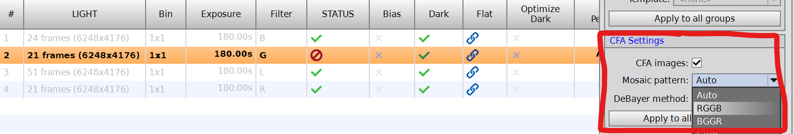 もしならないならカラー化するときのベイヤー配列の設定が間違っているのかもしれません。Celestron Origin Mark IIに使われているセンサーはIMX678だそうで、そのベイヤー配列はスタンダードなRGGB型のようです。WBPPの下のセッティングでMosaic PatternをRGGBに指定してやってみてください。