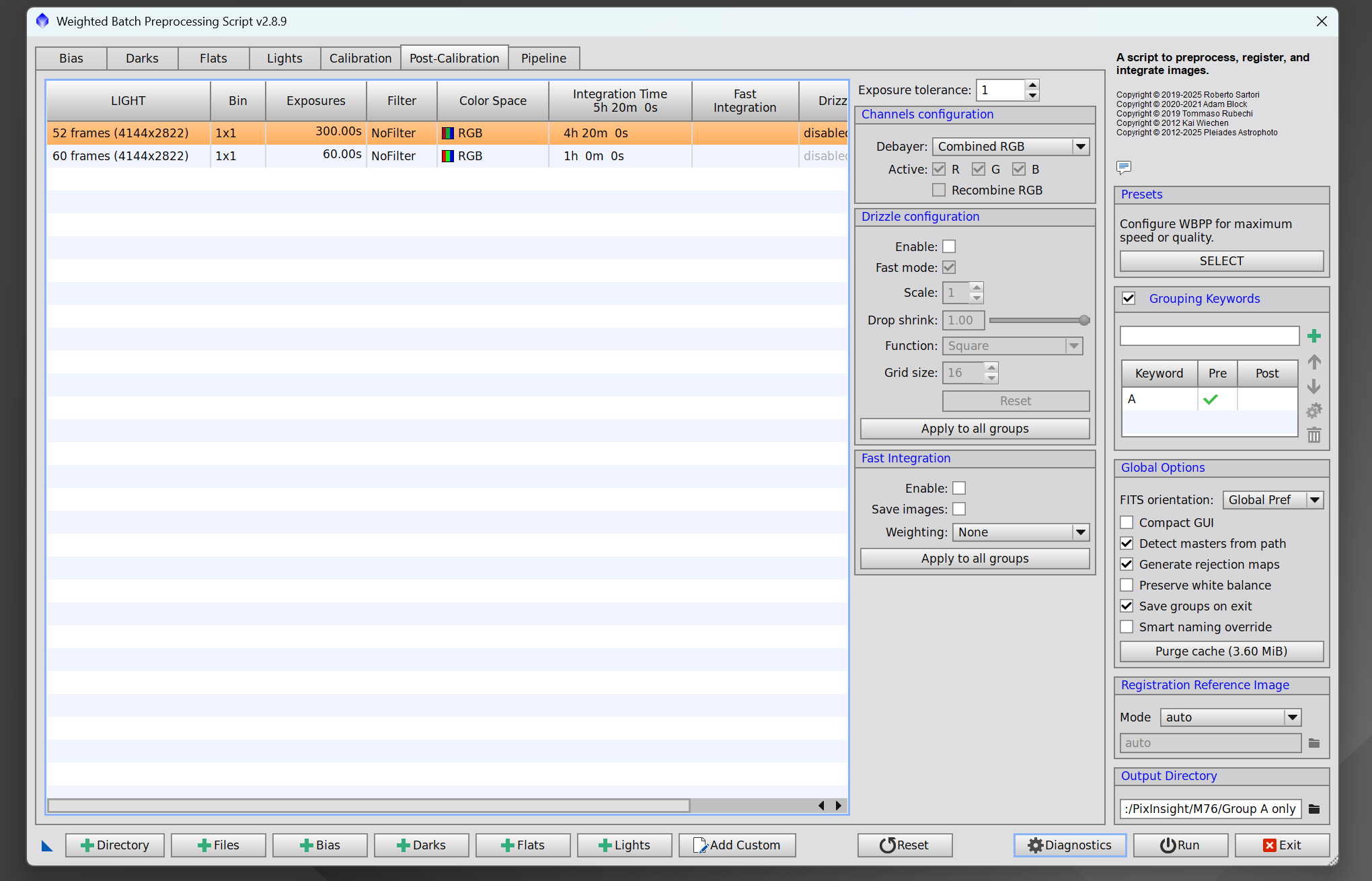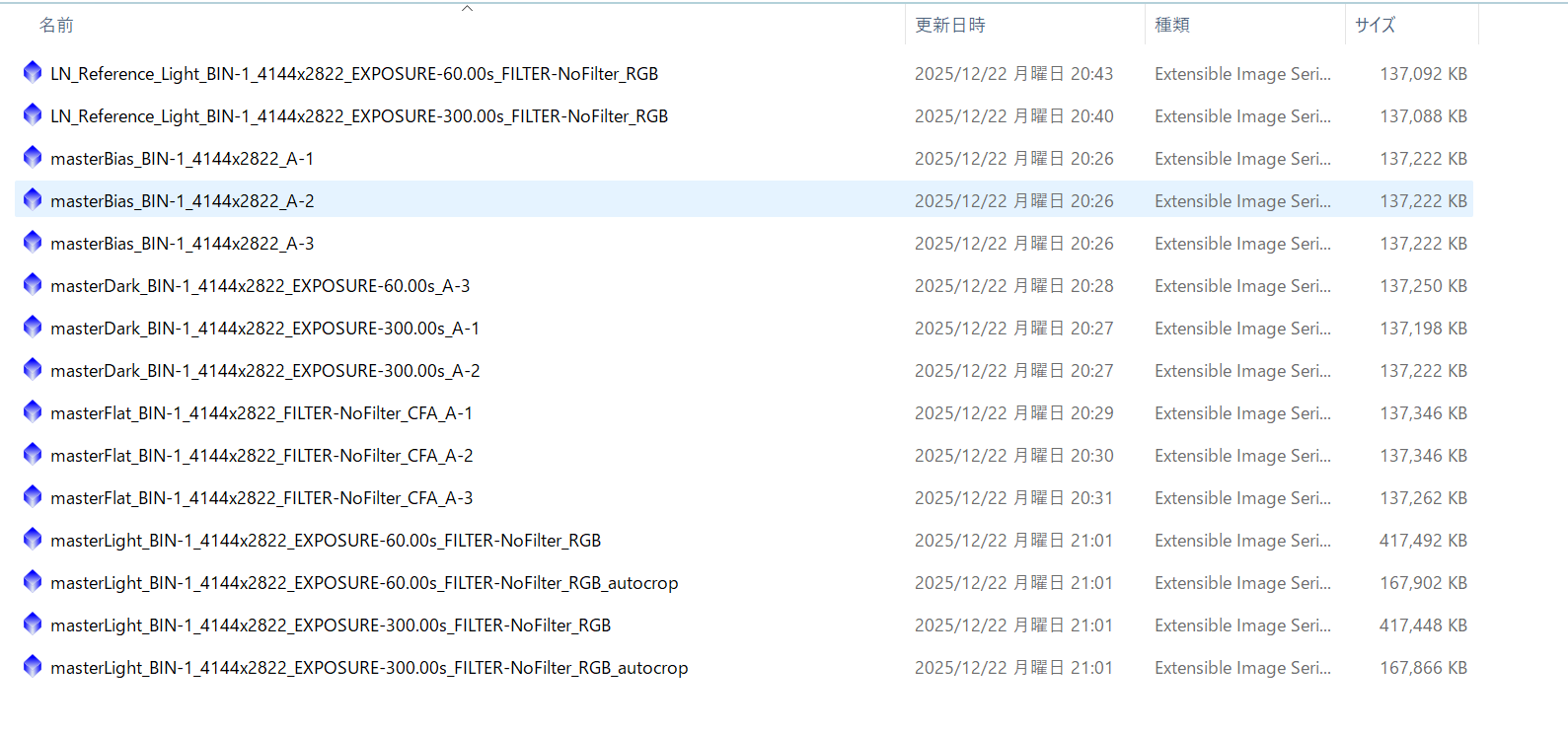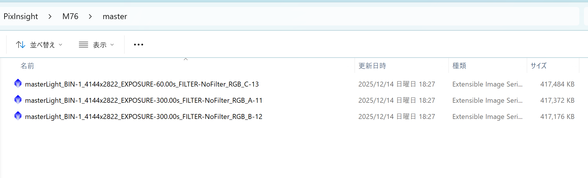 WBPPのグループ分けについて 2025.12.21 検索: このトピックには5件の返信、1人の参加者があり、最後にMasahiko Niwa/丹羽雅彦により9時間、 31分前に更新されました。 6件の投稿を表示中 - 1 - 6件目 (全6件中) 投稿者 投稿 2025年12月21日 18:41 #26962 返信 mikyゲスト 丹羽様 いつも当質問コーナーにはお世話になっています。 今回の質問はWBPPのグループ分けについて質問させてください。 異なる日時、撮影条件をWBPPでグループ分けして処理を実行しました。 すべてのグループの画像で1個のmasterファイルが作成されることを期待していたのですが、 グループ毎にmasterファイルが作成されてしまいました。 WBPPの画像を添付いたしますので、どこが原因でまとめて1個のmasterファイルが作成されなかったのかご教示をお願いいたします。 2025年12月22日 00:12 #26965 返信 Masahiko Niwa/丹羽雅彦キーマスター Groupingを設定する画面で、歯車ボタンを押してPostのチェックを外すと、Masterが一つになると思います。 PreをチェックするとCalibrationがグループごとに PostをチェックするとIntegrationがグループごとに 実行されます。 もしわからない場合は、ご質問ください! 2025年12月22日 09:40 #26966 返信 mikyゲスト 丹羽様 早速ご回答いただき、ありがとうございます。 ご案内のとおり、Groupingを設定する画面で歯車ボタンを押してPostのチェックを外して処理を実行したところ、 露出時間ごとにmasterファイルが作成されました。 露出時間も含めて、一つのmasterファイルは作るにはどうしたらいいのでしょうか。 よろしくお願いいたします。 2025年12月22日 18:00 #26968 返信 Masahiko Niwa/丹羽雅彦キーマスター よく見てみたらAとB、Cという3つのグループができています。Grouping 機能を使うには一つのキーワードで一つのグループを作ります。 A_1、A_2、A_3というフォルダに入れて、KEYWORDをAに指定して実行してみてください。 またその際にPOSTはチェックを外してください。 2025年12月22日 21:59 #26969 返信 mikyゲスト 丹羽 様 ご案内の通りAという一つのキーワードで、A_1、A_2、A_3というフォルダに入れて、KEYWORDをAに指定して実行しましたが、露出時間ごとにグループ分けされてmasterファイルが作成されてしまいます。 Exposure toleranceを「2」から「1」に変更して実行しても、ダメでした。 キーワードによるグルー分けよりも露出時間によるグループ分けが優先されるためなのでしょうか。 2025年12月23日 20:51 #26973 返信 Masahiko Niwa/丹羽雅彦キーマスター あ、そうでした。失礼しました。 Post CalibrationのExposure toleranceを300に設定してみてください。これはどれくらい露光時間の異なる画像を一緒に処理するかを設定します。300にすると300秒異なる画像も一緒にIntegrationします。 LightタブにもExposure toleranceがありますが、Calibrationは別々にしたいのでLightタブではExposure toleranceを2のままでOKです。Post CalibrationタブのExposure toleranceを300にしてみてください。 これで露光時間が異なっても一緒にIntegrationしてくれます。重みをつけているので、品質の高い300秒の方が高い重みで実行されます。 投稿者 投稿 6件の投稿を表示中 - 1 - 6件目 (全6件中) 返信先: WBPPのグループ分けについて あなたの情報: お名前 (必須) メール (非公開) (必須): ウェブサイト: ビジュアル コード 送信