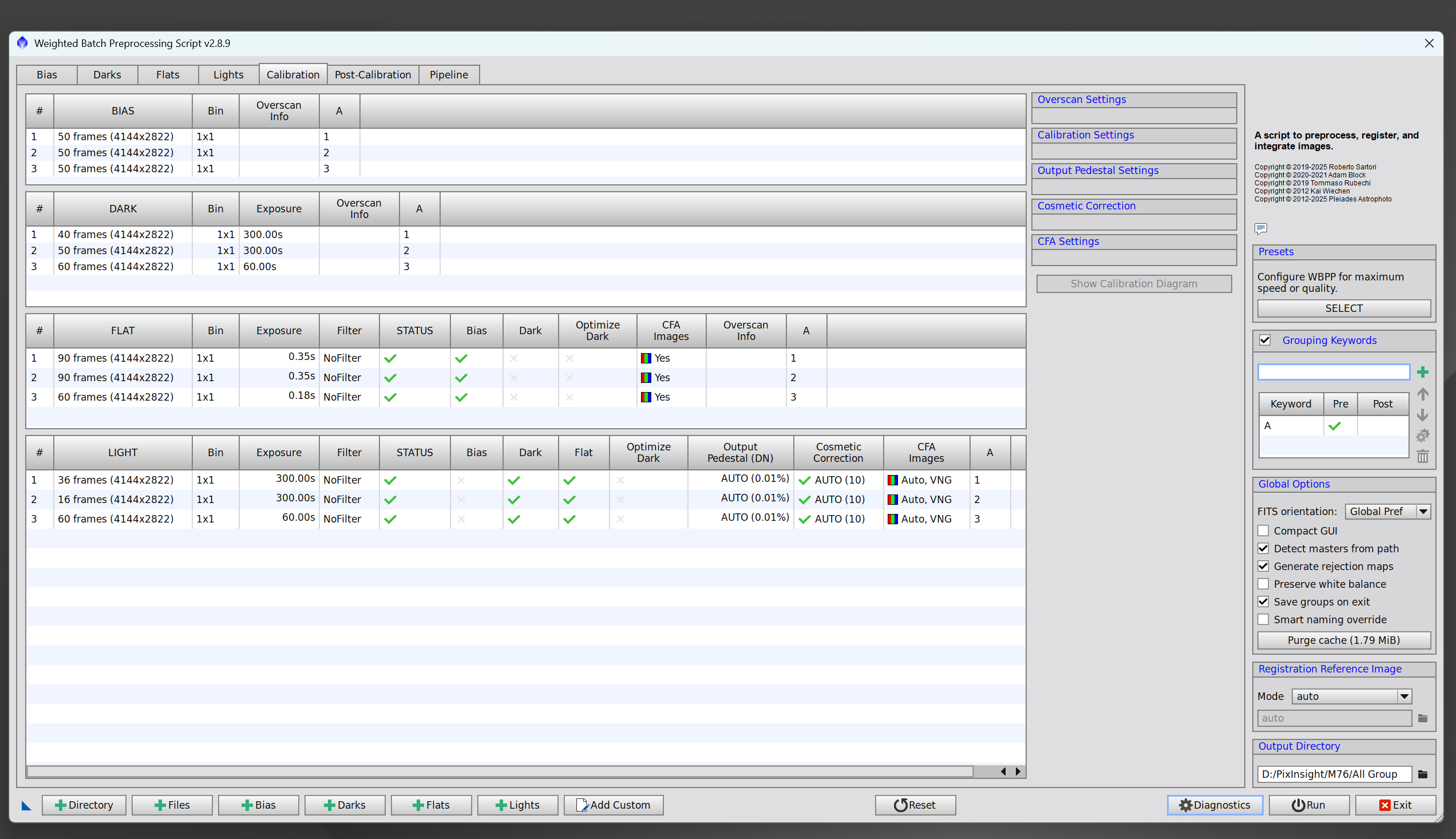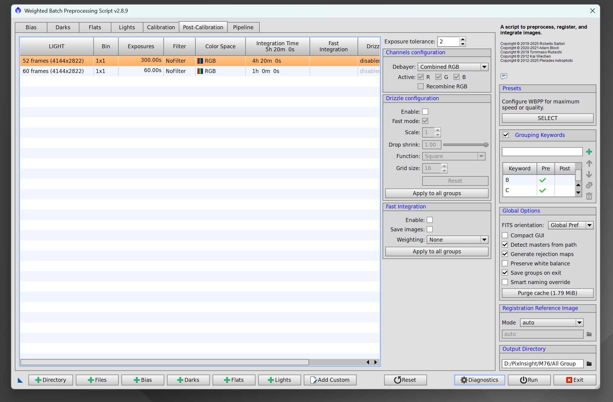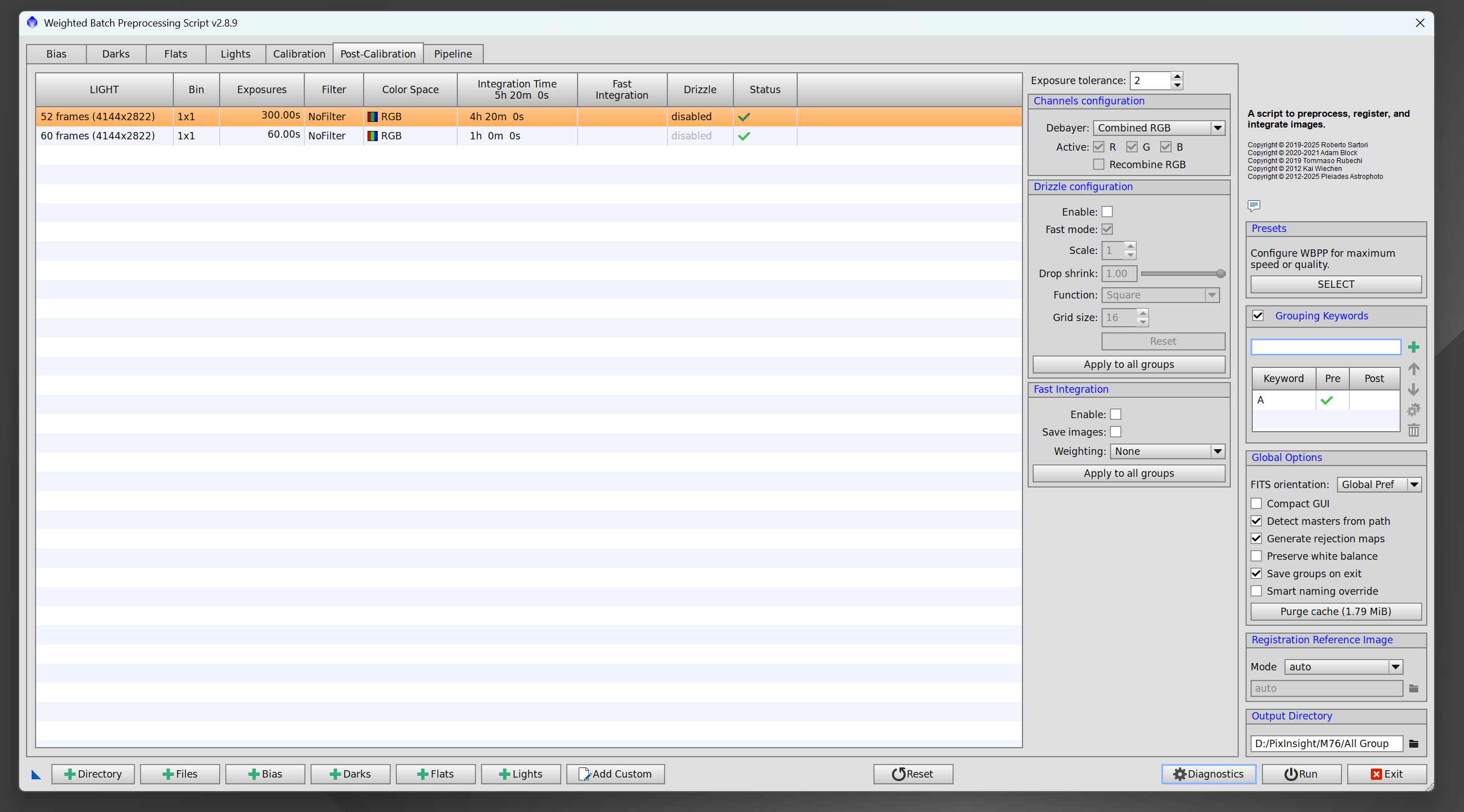 WBPPのグループ分けについて 2025.12.21 検索: このトピックには5件の返信、1人の参加者があり、最後にMasahiko Niwa/丹羽雅彦により9時間、 31分前に更新されました。 6件の投稿を表示中 - 1 - 6件目 (全6件中) 投稿者 投稿 2025年12月21日 18:41 #26962 返信 mikyゲスト 丹羽様 いつも当質問コーナーにはお世話になっています。 今回の質問はWBPPのグループ分けについて質問させてください。 異なる日時、撮影条件をWBPPでグループ分けして処理を実行しました。 すべてのグループの画像で1個のmasterファイルが作成されることを期待していたのですが、 グループ毎にmasterファイルが作成されてしまいました。 WBPPの画像を添付いたしますので、どこが原因でまとめて1個のmasterファイルが作成されなかったのかご教示をお願いいたします。 2025年12月22日 00:12 #26965 返信 Masahiko Niwa/丹羽雅彦キーマスター Groupingを設定する画面で、歯車ボタンを押してPostのチェックを外すと、Masterが一つになると思います。 PreをチェックするとCalibrationがグループごとに PostをチェックするとIntegrationがグループごとに 実行されます。 もしわからない場合は、ご質問ください! 2025年12月22日 09:40 #26966 返信 mikyゲスト 丹羽様 早速ご回答いただき、ありがとうございます。 ご案内のとおり、Groupingを設定する画面で歯車ボタンを押してPostのチェックを外して処理を実行したところ、 露出時間ごとにmasterファイルが作成されました。 露出時間も含めて、一つのmasterファイルは作るにはどうしたらいいのでしょうか。 よろしくお願いいたします。 2025年12月22日 18:00 #26968 返信 Masahiko Niwa/丹羽雅彦キーマスター よく見てみたらAとB、Cという3つのグループができています。Grouping 機能を使うには一つのキーワードで一つのグループを作ります。 A_1、A_2、A_3というフォルダに入れて、KEYWORDをAに指定して実行してみてください。 またその際にPOSTはチェックを外してください。 2025年12月22日 21:59 #26969 返信 mikyゲスト 丹羽 様 ご案内の通りAという一つのキーワードで、A_1、A_2、A_3というフォルダに入れて、KEYWORDをAに指定して実行しましたが、露出時間ごとにグループ分けされてmasterファイルが作成されてしまいます。 Exposure toleranceを「2」から「1」に変更して実行しても、ダメでした。 キーワードによるグルー分けよりも露出時間によるグループ分けが優先されるためなのでしょうか。 2025年12月23日 20:51 #26973 返信 Masahiko Niwa/丹羽雅彦キーマスター あ、そうでした。失礼しました。 Post CalibrationのExposure toleranceを300に設定してみてください。これはどれくらい露光時間の異なる画像を一緒に処理するかを設定します。300にすると300秒異なる画像も一緒にIntegrationします。 LightタブにもExposure toleranceがありますが、Calibrationは別々にしたいのでLightタブではExposure toleranceを2のままでOKです。Post CalibrationタブのExposure toleranceを300にしてみてください。 これで露光時間が異なっても一緒にIntegrationしてくれます。重みをつけているので、品質の高い300秒の方が高い重みで実行されます。 投稿者 投稿 6件の投稿を表示中 - 1 - 6件目 (全6件中) 返信先: WBPPのグループ分けについて あなたの情報: お名前 (必須) メール (非公開) (必須): ウェブサイト: ビジュアル コード 送信