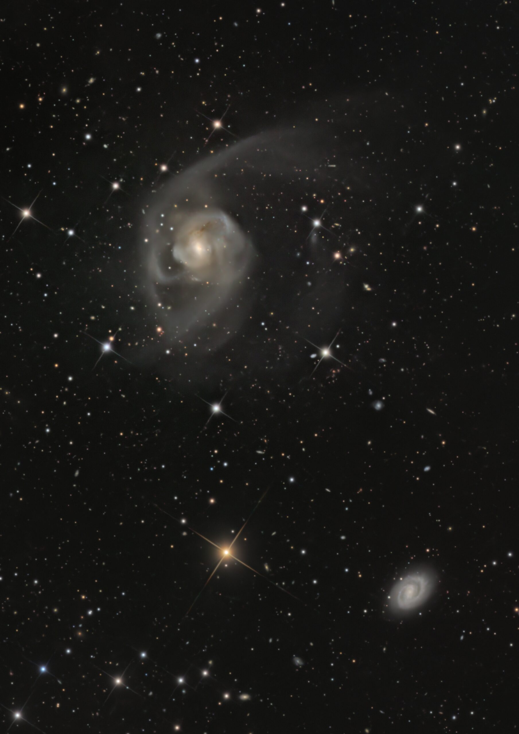 NGC 7727は10億年前に2つの銀河が衝突合体したできた銀河で、このぐちゃぐちゃした恒星ストリームは衝突の時の重力作用でできたそうです。銀河同士の合体はまだ完了しておらず、中央には2つの銀河のコアが観測されています。天文台が出しているコアの画像と私を見比べたところ、私の写真にも2つのコアが写っていました。下記の画像の明るい2つの点と考えてよさそうです(上の画像でも拡大すると見えますが、見やすいように明るさを変えました)